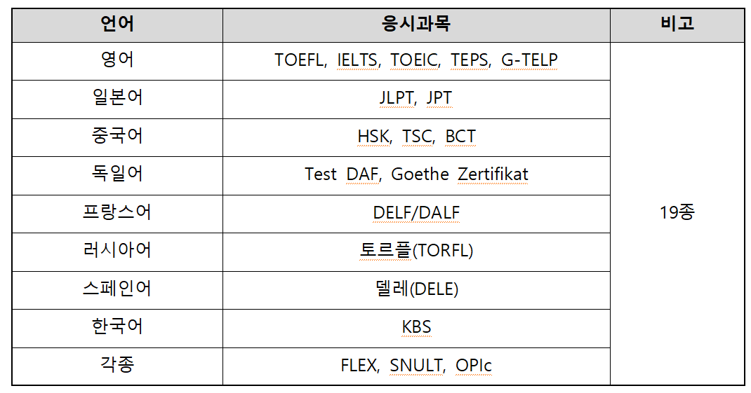 어학시험 19종은 아래와 같습니다.