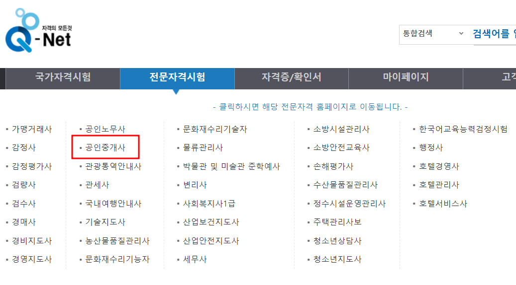 2. 전문자격시험 메뉴에서 공인중개사를 클릭합니다.