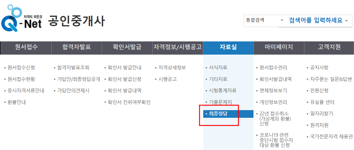 1. 기출시험지 다운로드 방법과 동일하게 큐넷 접속 후 공인중개사 메뉴로 접속합니다.