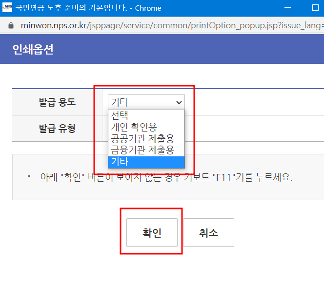7. 마지막으로 인쇄옵션에서 발급용도와 발급 유형을 선택하고 확인을 누르면 완료!
