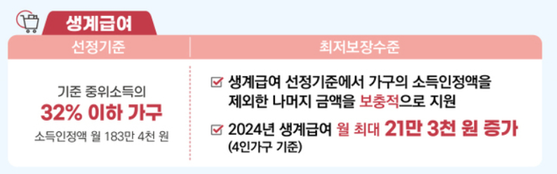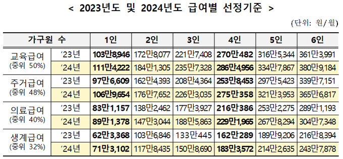 기준 중위소득 및 급여별 선정기준 (2024년도)