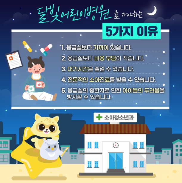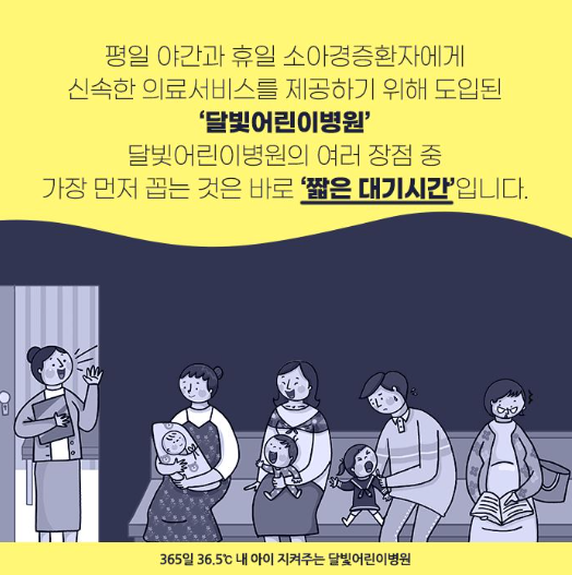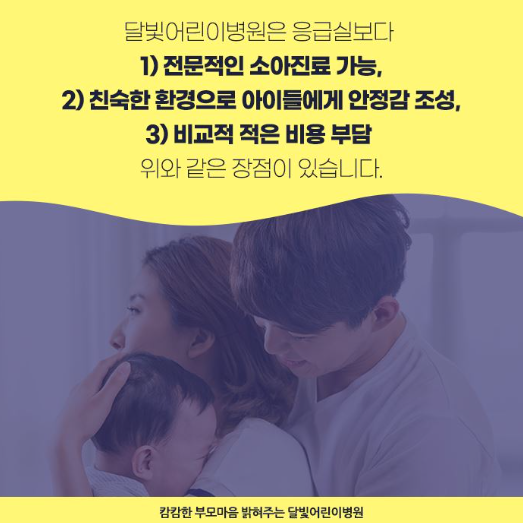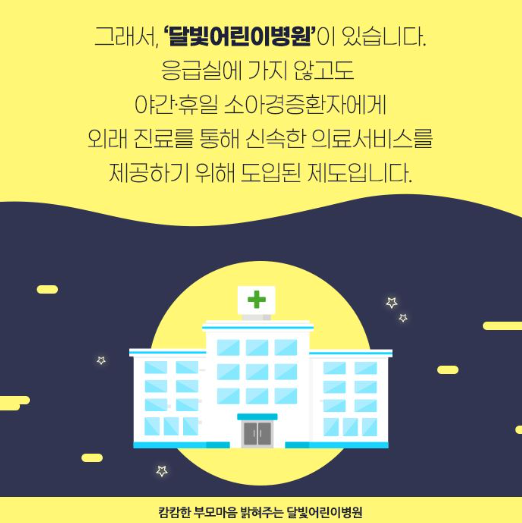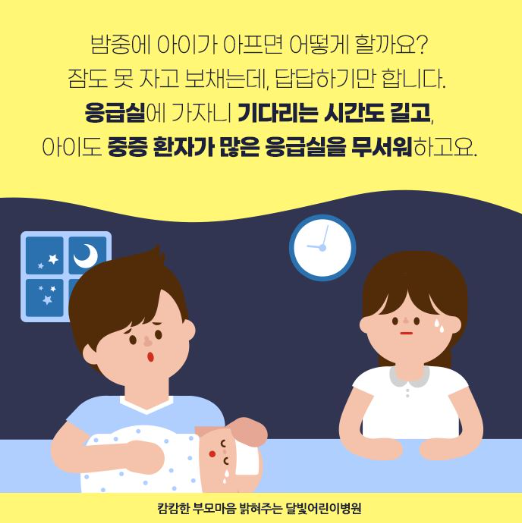 밤중에 아이가 아플때 찾게 되는 응급실. 하지만 주변에 소아를 전문으로 하는 응급실이 없을 때도 있고, 있더라도 중증환자가 많은 응급실에 아이가 겁을 낼 수도 있습니다. 이러한 문제점을 해결하기 위해 도입된 병원이 달빛어린이병원입니다.