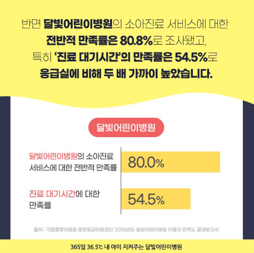 응급실에 갔을때 가장 큰 불만은 아무래도 너무 긴 대기시간 입니다. 더구나 야간응급실은 넘쳐나는 환자들로 더 긴 대기시간을 각오해야 합니다. 중증환자가 아닌 소아경증환자의 경우에 더 불편함을 느낄수 있는 지점입니다. 응급실과 비교해서 더 짦은 대기시간과 함께 필요한 진료만 간단하게 바로 받을수 있다는 장점이 있습니다.