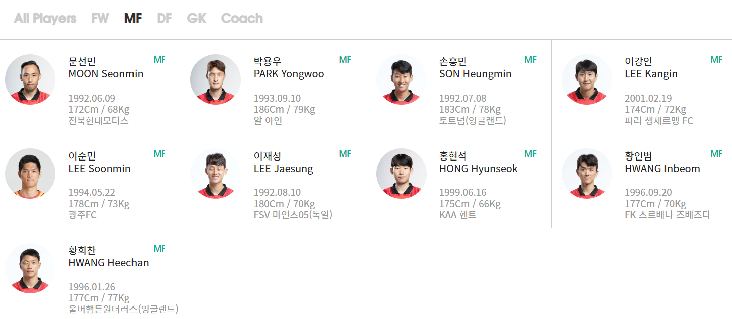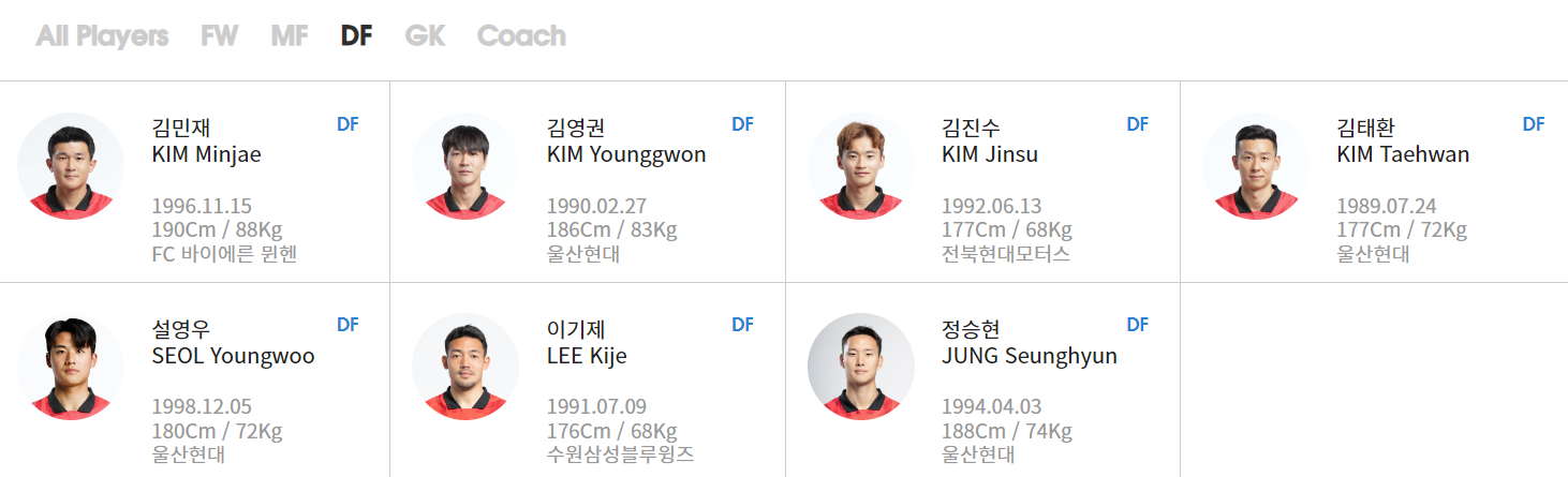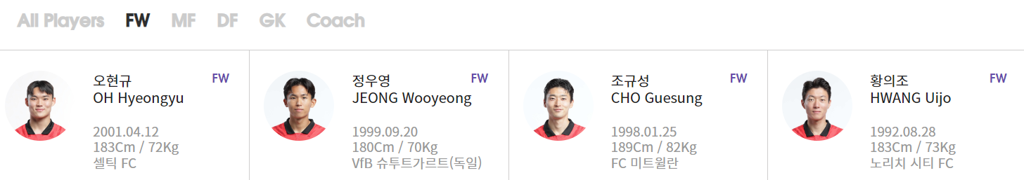 GK: 김승규(알샤밥), 조현우(울산현대), 송범근(쇼난 벨마레)