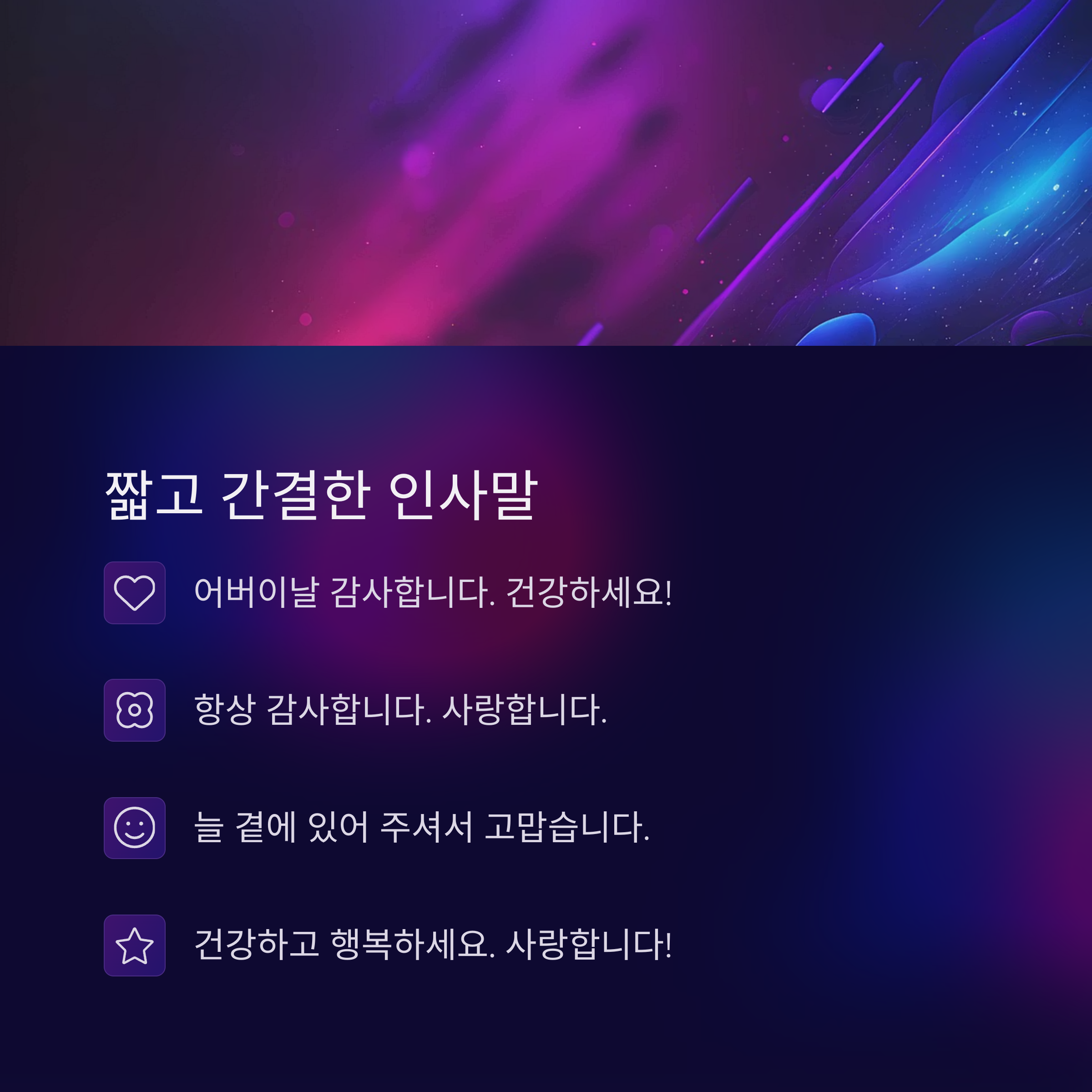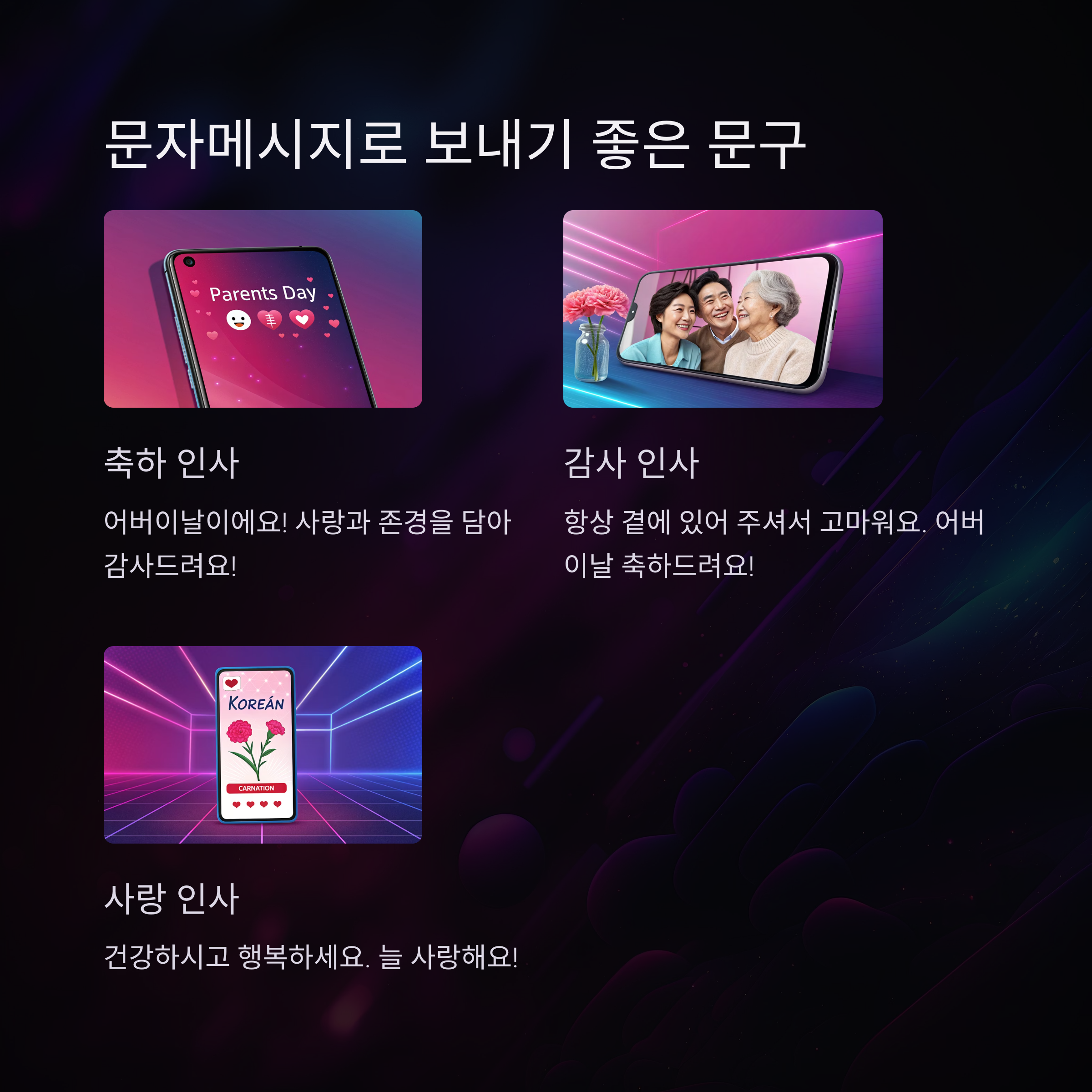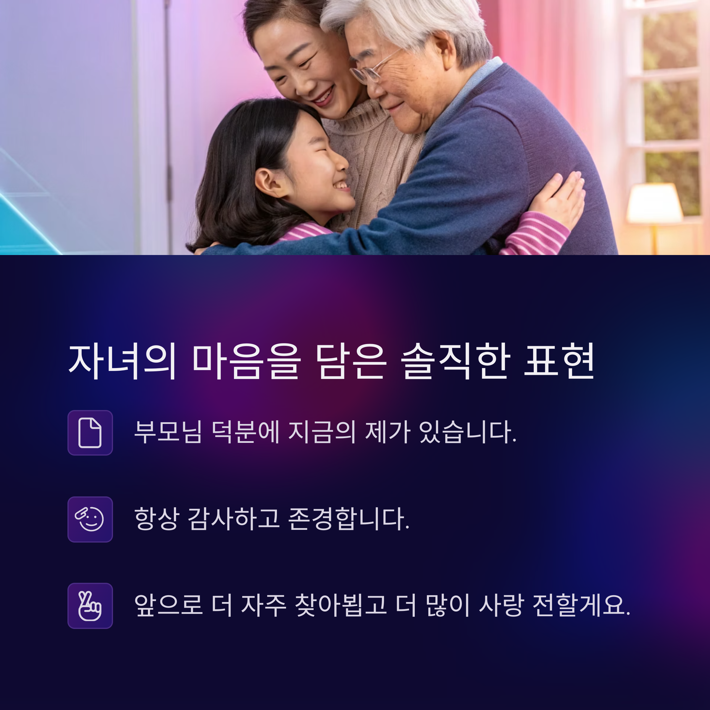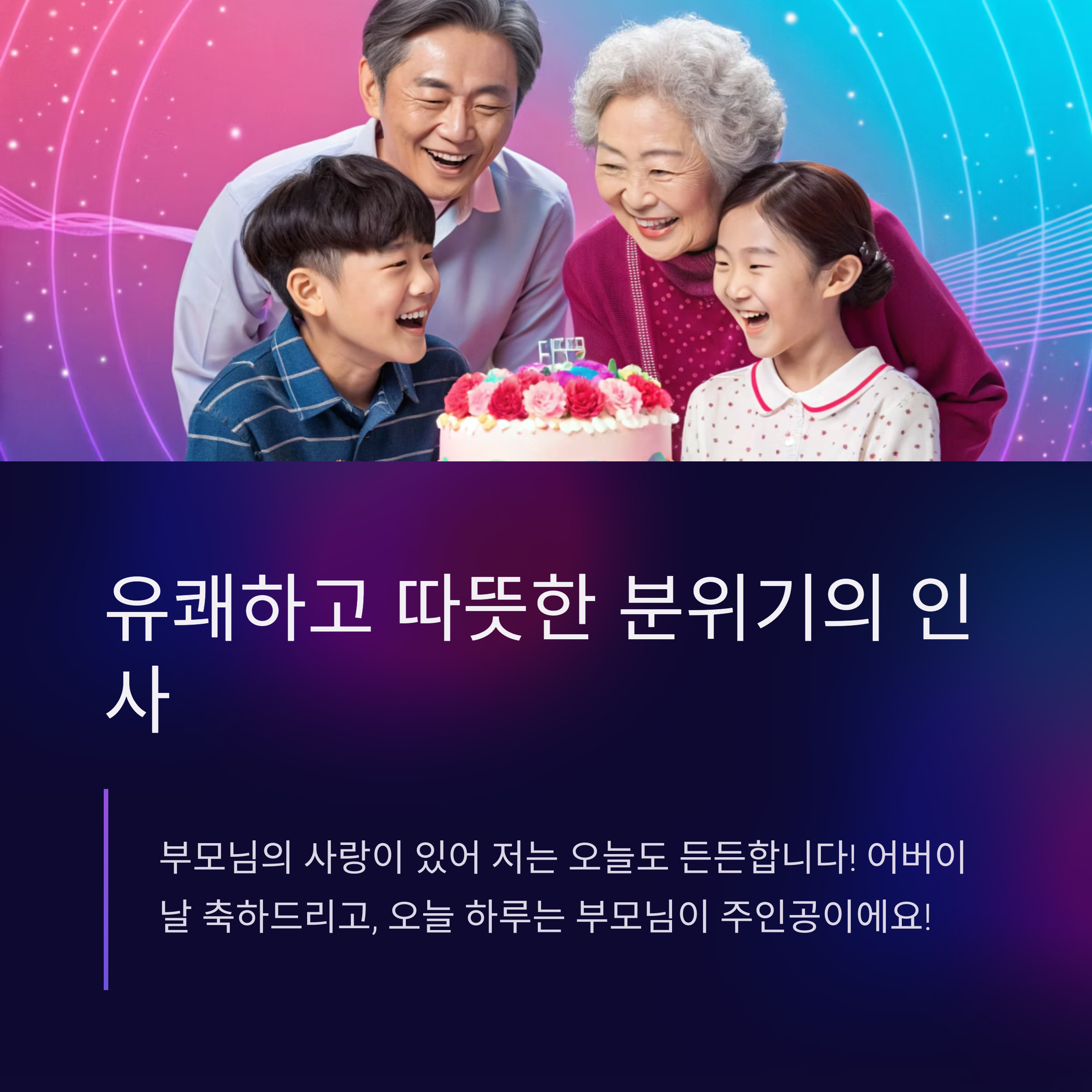 | 친근한 인사 | "부모님 사랑해요! 행복하세요!" |