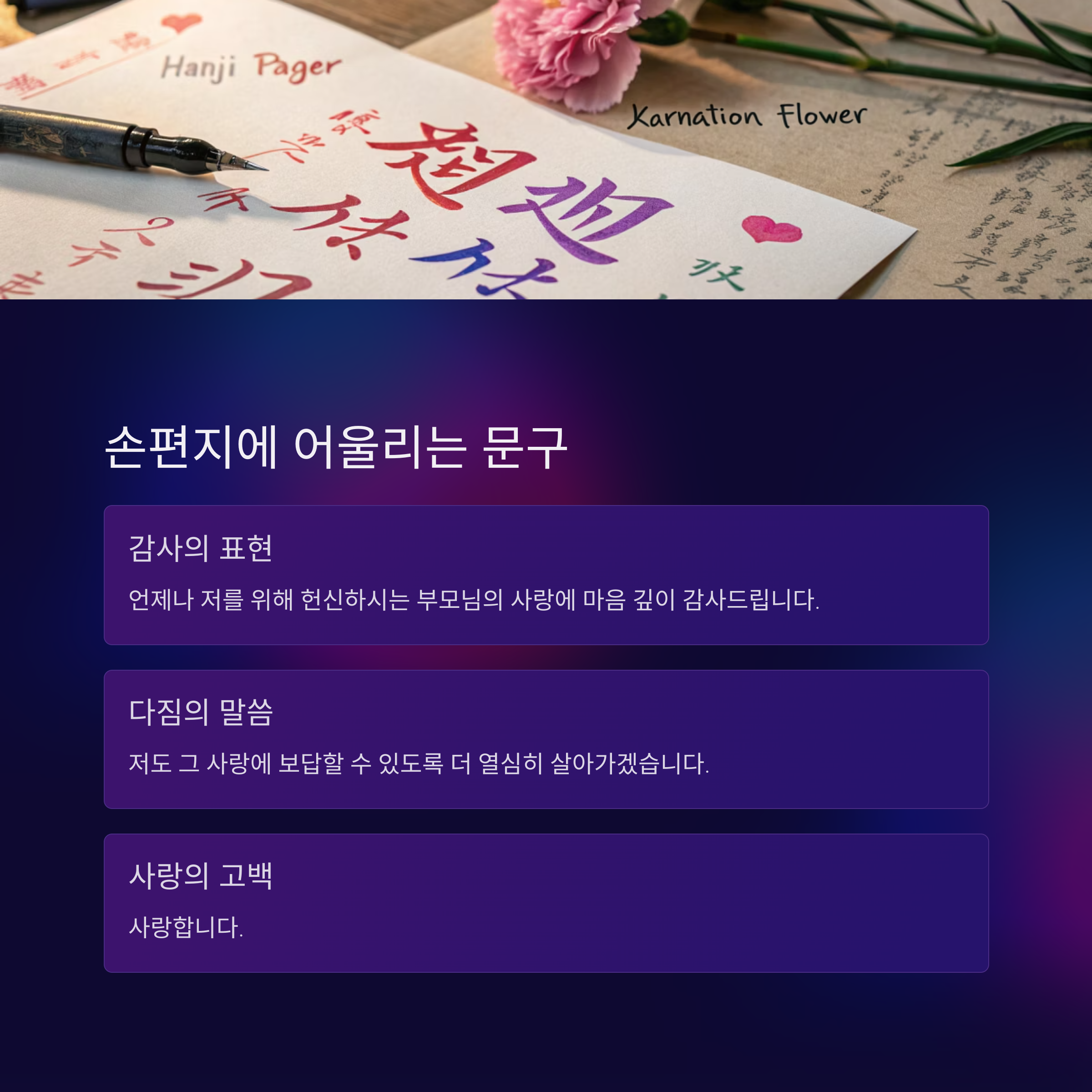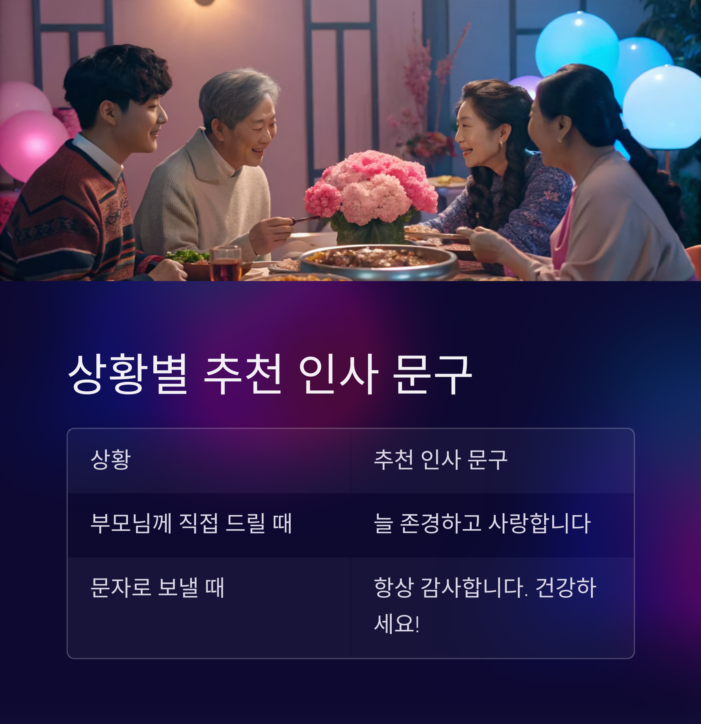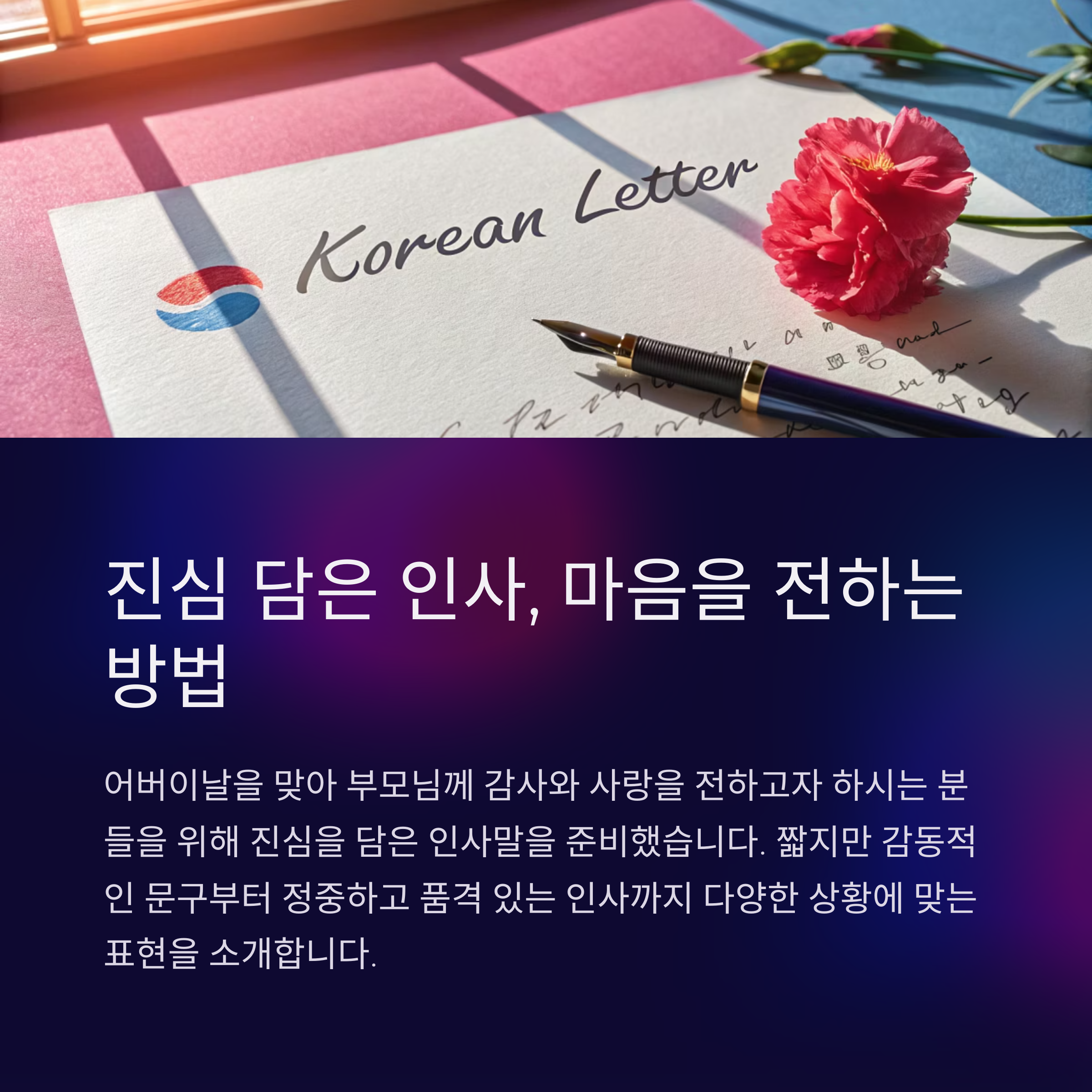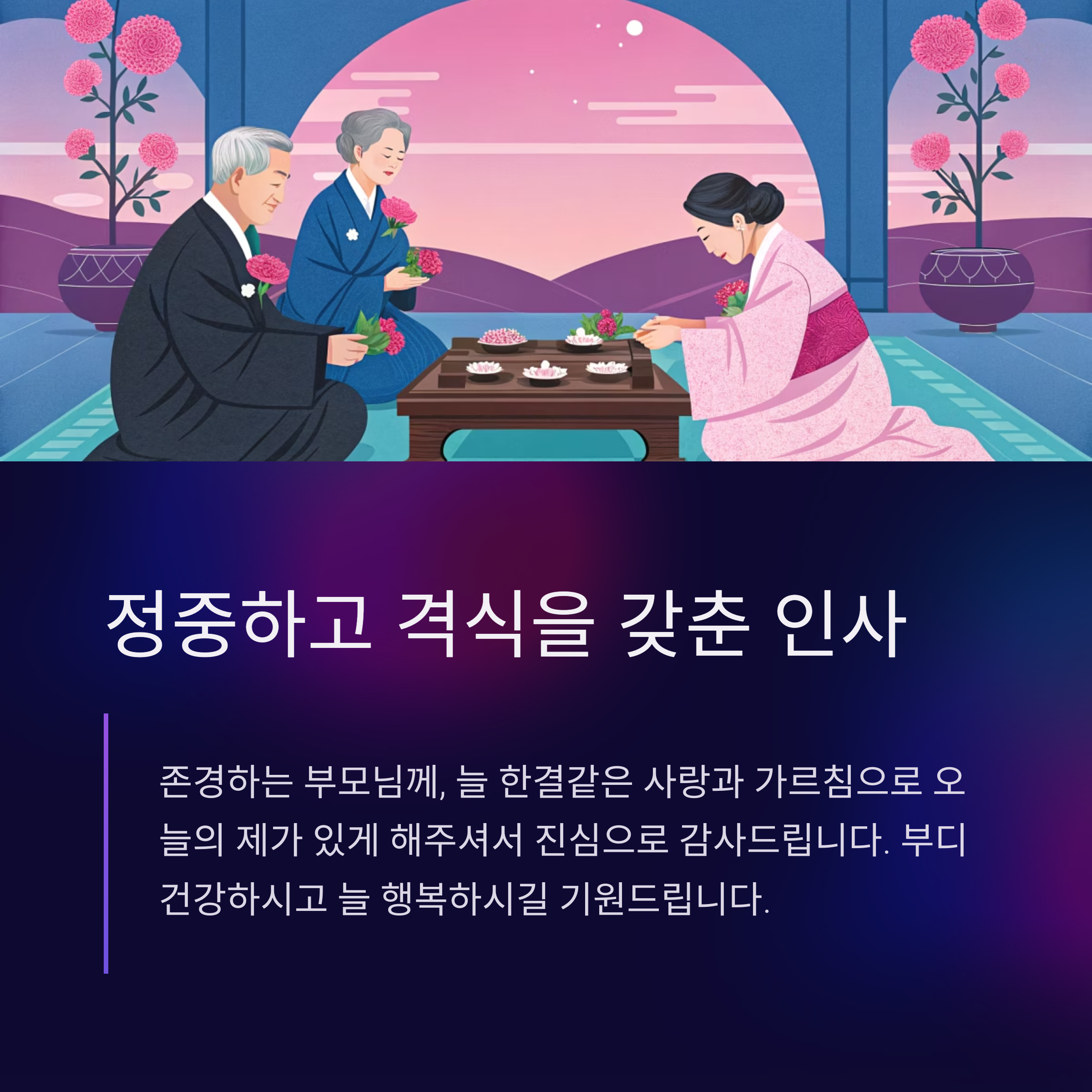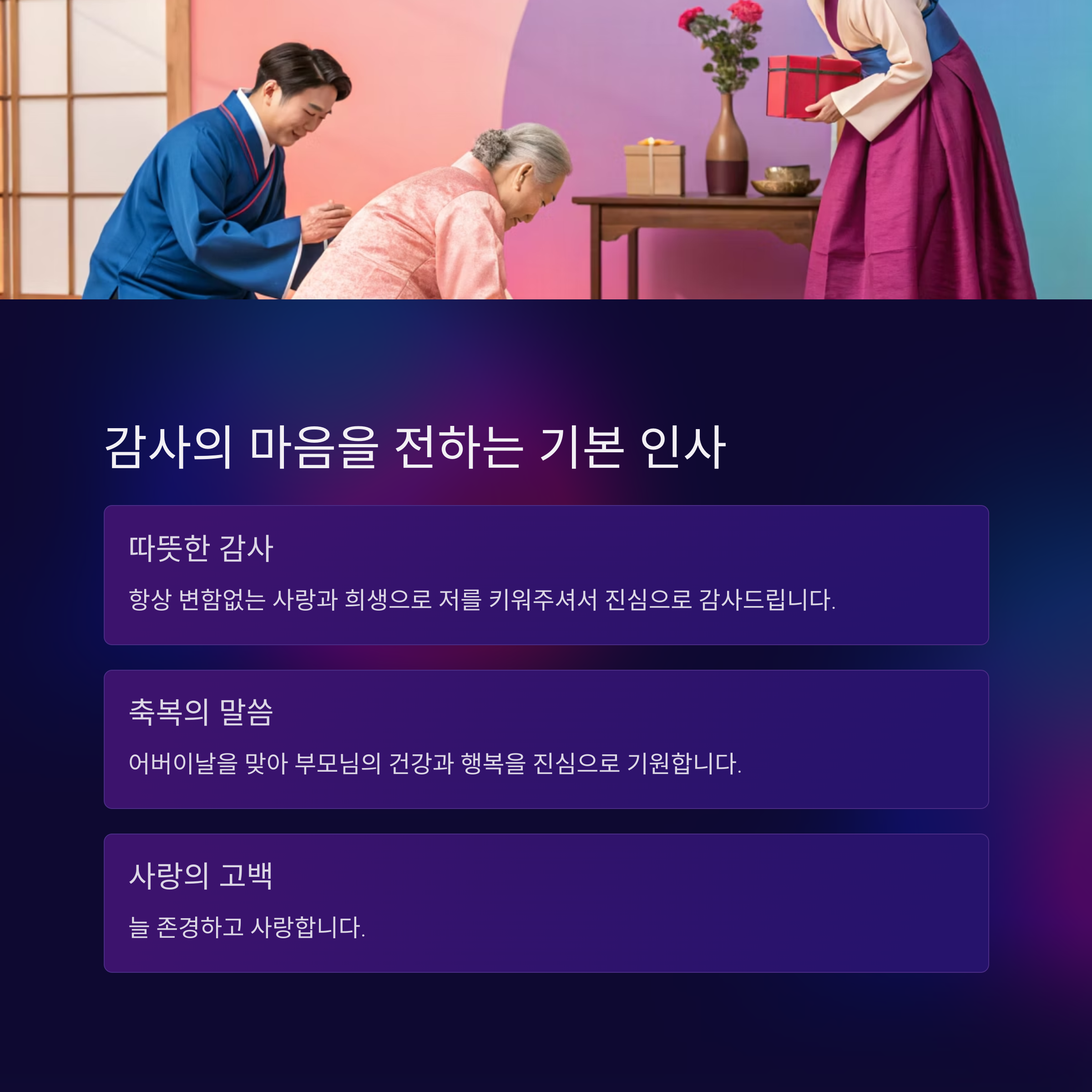 | 격식 있는 인사 | "존경하는 부모님께 감사드립니다." |