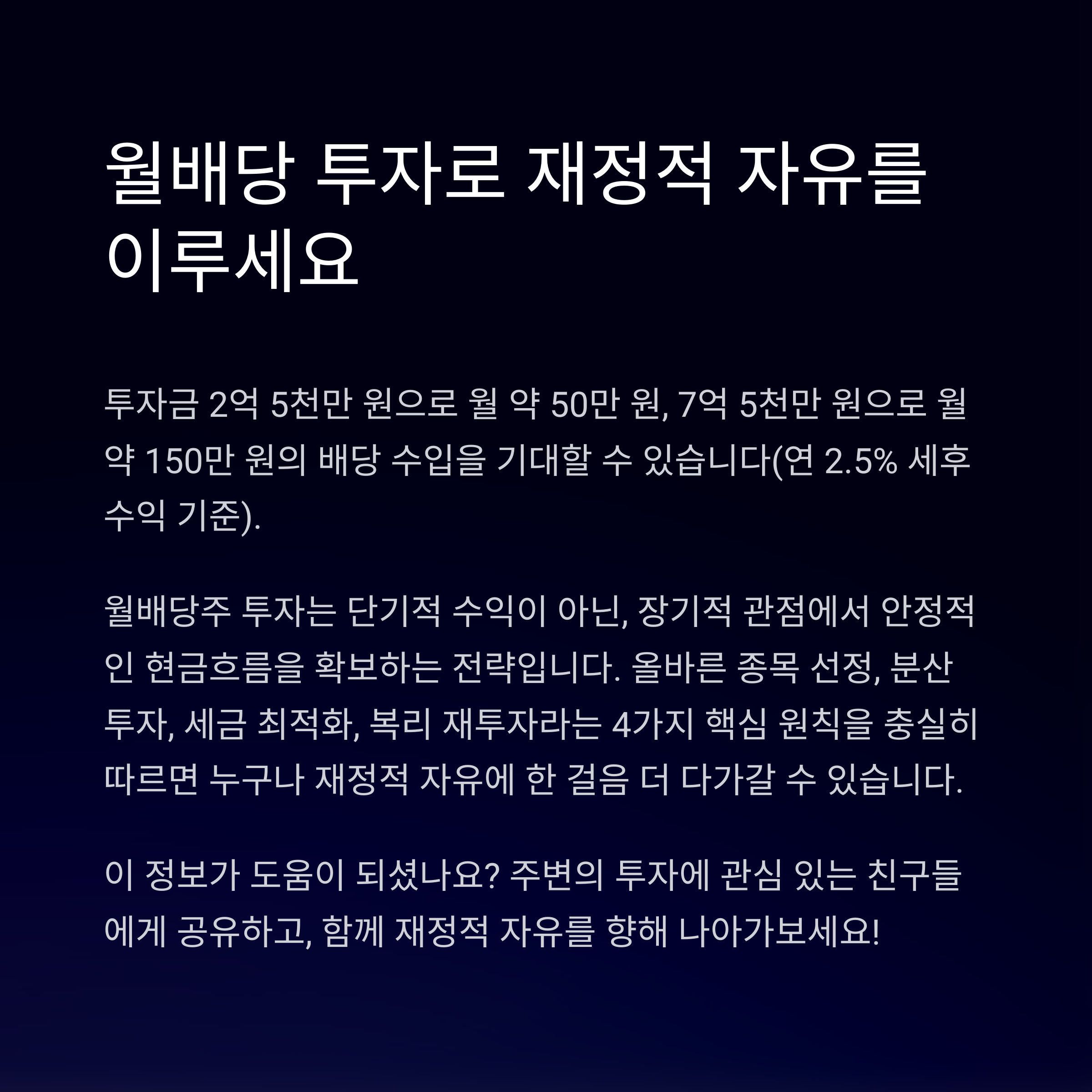 월배당주 투자는 단기적 수익을 노리는 것이 아니라, 장기적 관점에서 안정적인 현금흐름을 확보하는 전략입니다.