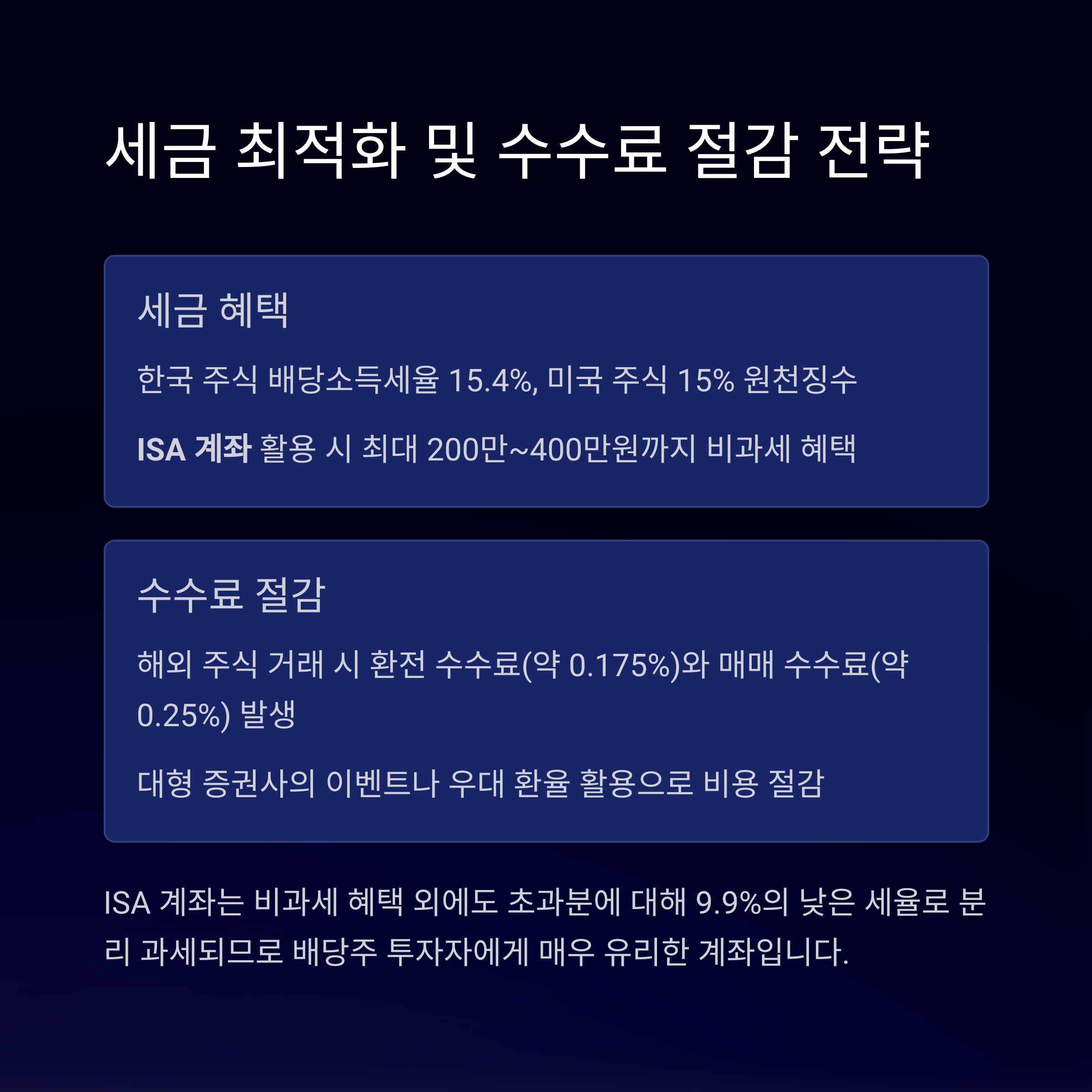 배당주 투자는 세금과 비용 관리도 매우 중요합니다. 한국 주식 배당소득세율은 15.4%이며, 미국 주식은 15% 원천징수 후 별도 추가 과세는 없습니다.