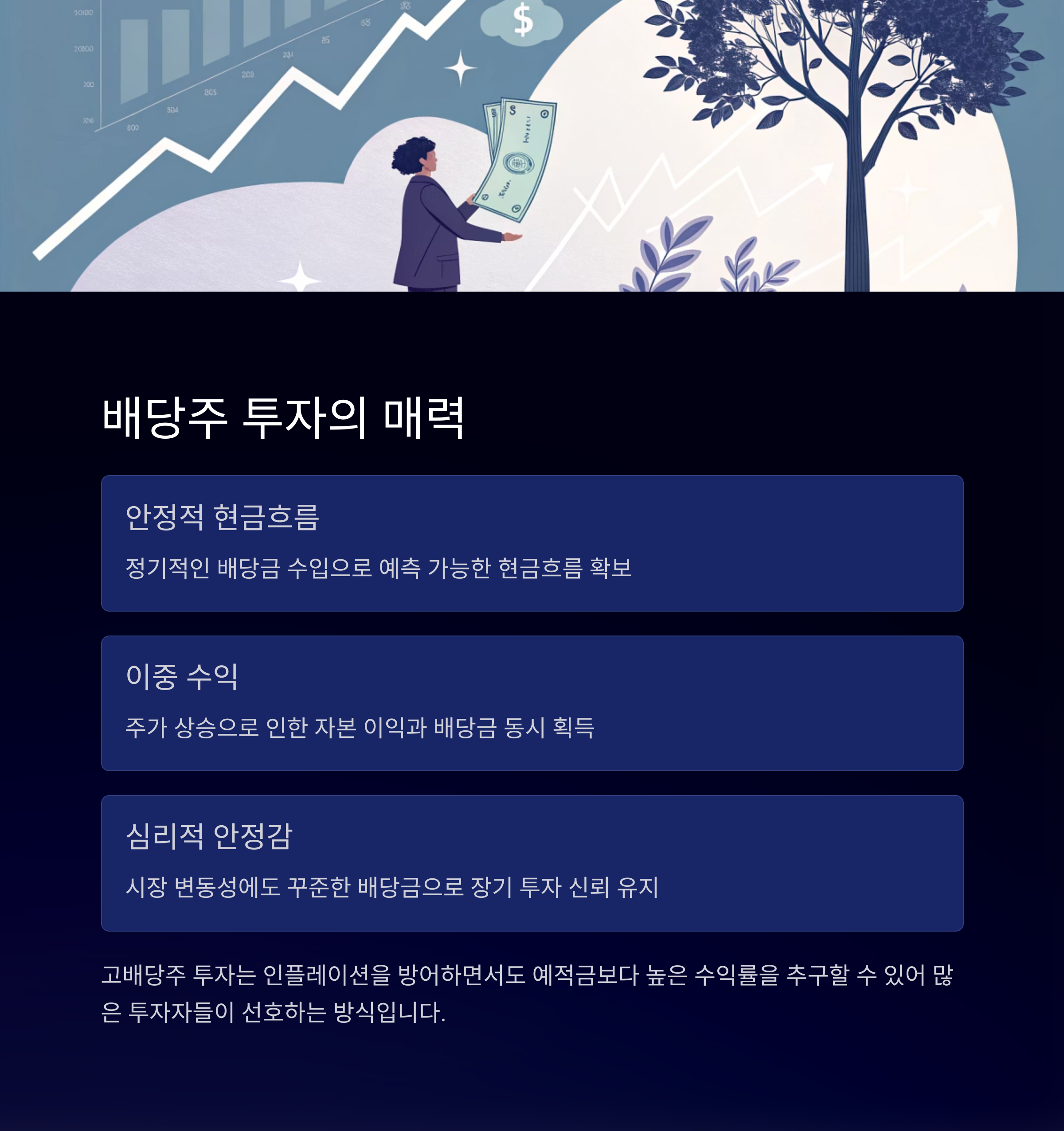 특히 고배당주를 통해 투자자는 인플레이션을 방어하면서도 안정적인 수익을 기대할 수 있습니다. 예적금보다 높은 수익률을 추구하면서 리스크를 관리할 수 있다는 점에서 많은 투자자들이 선호하는 방식입니다.