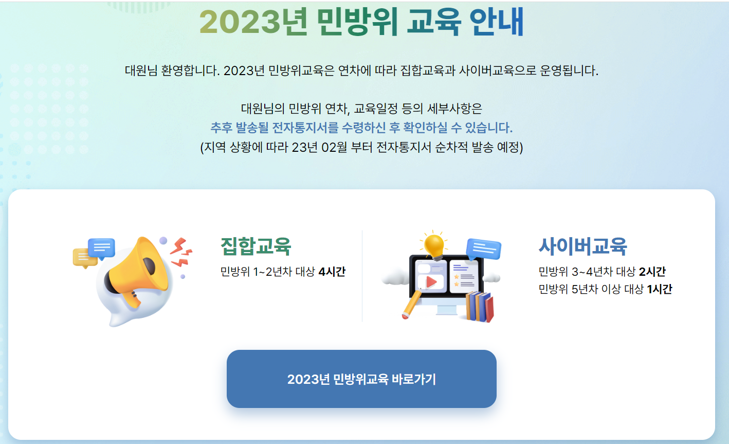 2. 민방위 사이버교육 사이트에 접속 후 민방위교육 바로가기 버튼을 누릅니다.