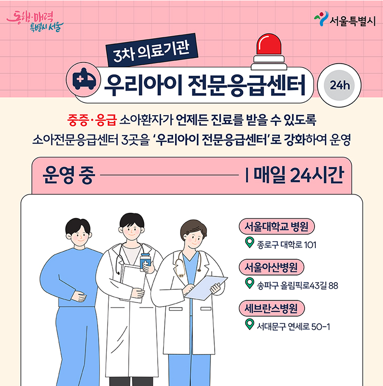 상급종합병원 소아전문센터 3곳(서울대병원, 서울아산병원, 세브란스병원)에서 어린이들의 중증 질환 및 응급상황에 대비하여 운영 중입니다.