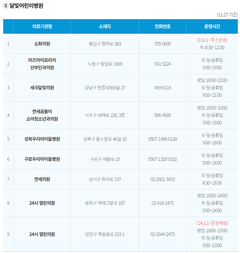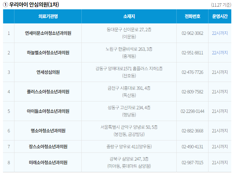 서울시 야간, 휴일 진료 소아과 병원 (서울형 야간 소아의료체계)