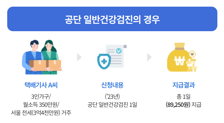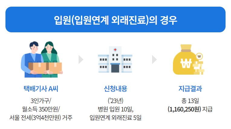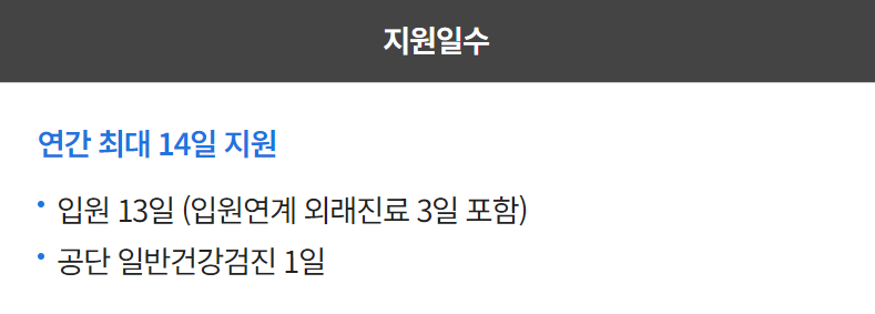 지원내용 : 연 최대 14일 생활비 지원(입원 13일(입원 연계 외래진료 3일 포함), 공단 일반건강검진 1일 )