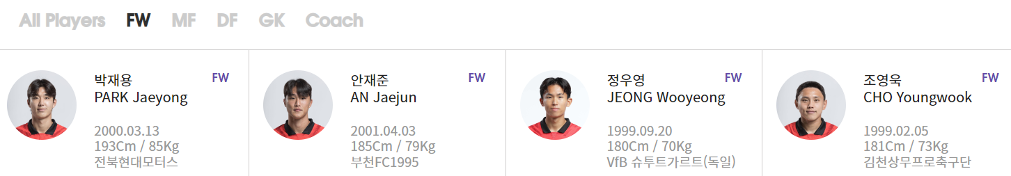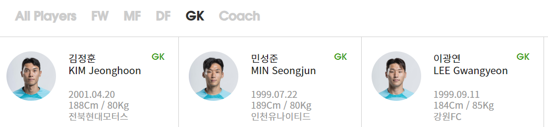 GK : 이광연(강원FC) 민성준(인천유나이티드) 김정훈(전북현대)