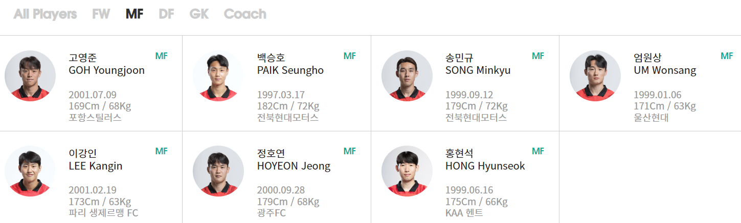 MF : 정호연(광주FC) 홍현석(KAA헨트, 벨기에) 백승호 송민규(이상 전북현대) 정우영(슈투트가르트, 독일) 고영준(포항스틸러스) 이강인(파리생제르맹, 프랑스) 엄원상(울산현대) 조영욱(김천상무)