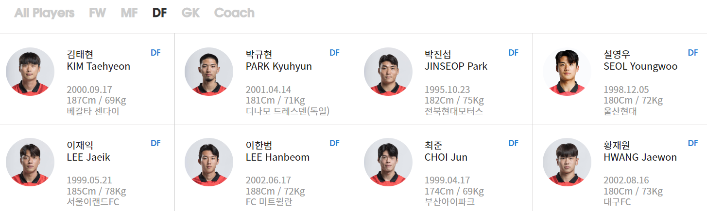DF : 설영우(울산현대) 박규현(디나모드레스덴, 독일) 이재익(서울이랜드) 이한범(FC서울) 박진섭(전북현대) 이상민(성남FC) 황재원(대구FC) 최준(부산아이파크)