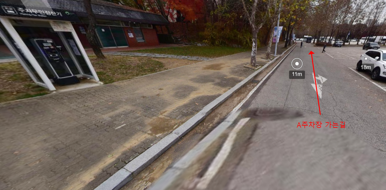 왼쪽에 보이는 화장실과 주차정산기를 끼고 쭉 직진하면 A주차장과도 연결되어 있습니다.