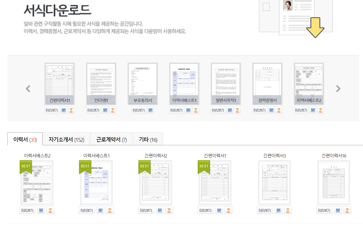 알바몬, 알바천국과 같은 채용 사이트의 자료실을 이용하면 간편하게 다양한 양식의 파일들을 다운받을 수 있으니 아래의 설명을 확인 해보세요!