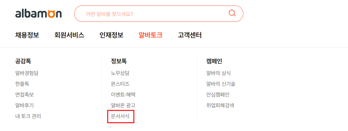 2. 알바토크 메뉴를 누르고 문서서식을 클릭합니다.