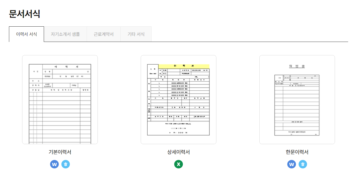 3. 문서서식에 들어가면 기본양식부터 한문 이력서 까지 다양한 형식의 이력서 서식을 다운로드 할 수 있습니다.