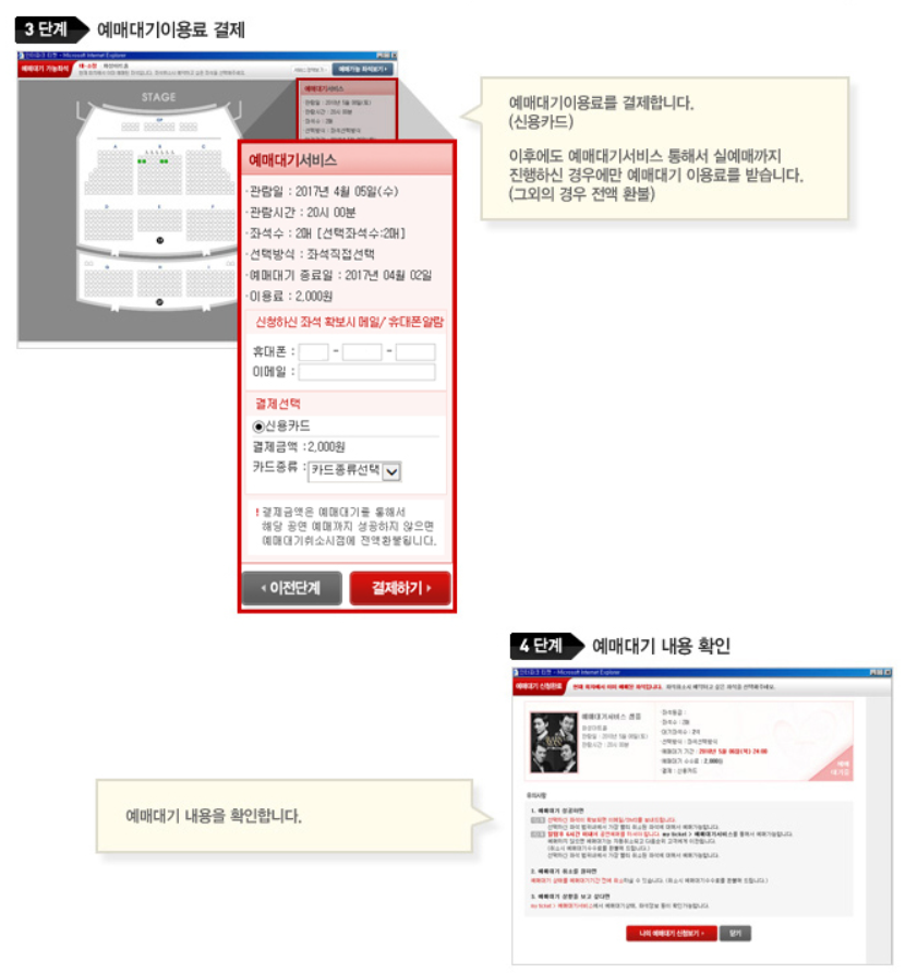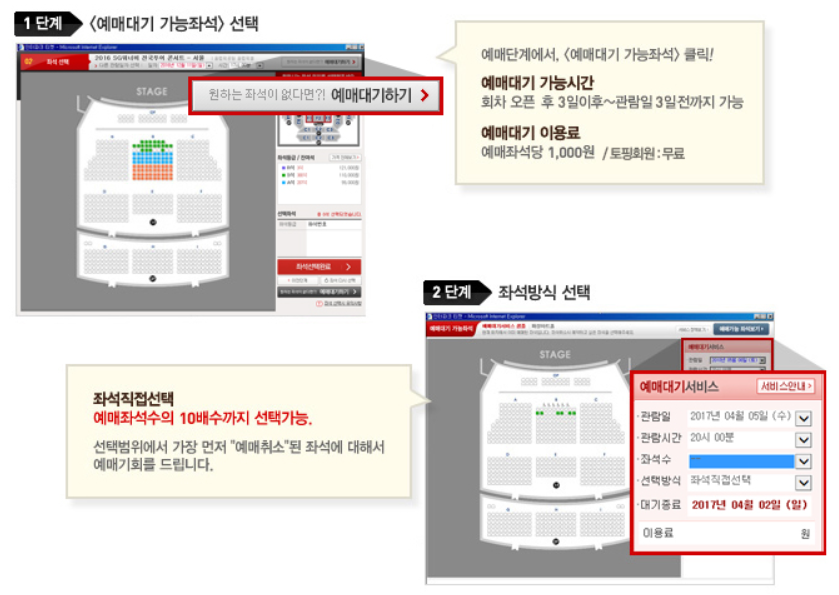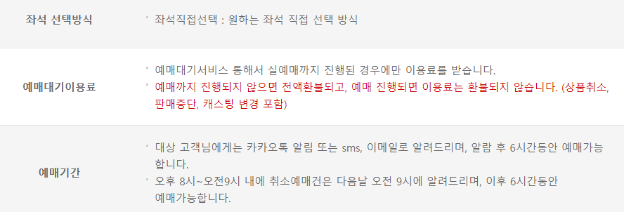 예매대기서비스로 원하는 공연/날짜/좌석을 선택해 놓으면, 해당 좌석이 취소되는 경우 고객님에게 알려드립니다.
