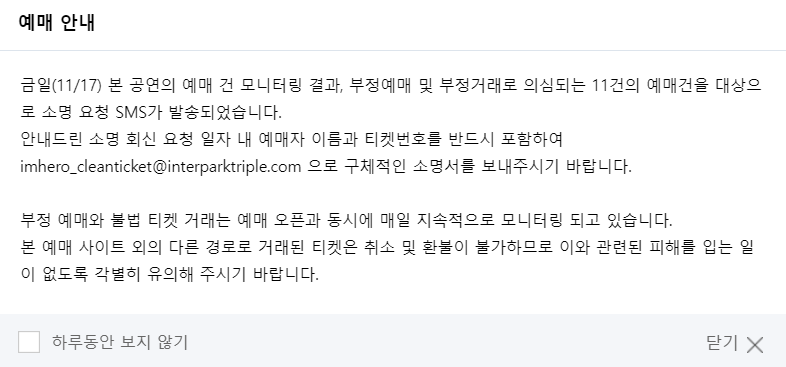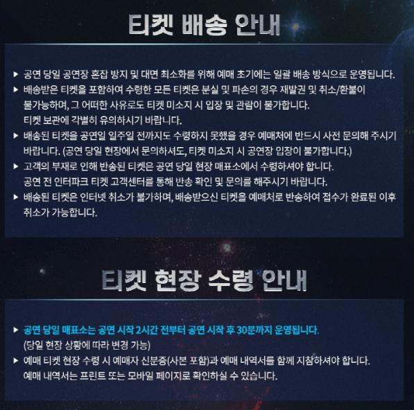 - 예매 완료 건에 대한 배송은[예매 페이지]에서 확인 가능하며, 이후 예매는 현장 수령으로만 가능합니다.