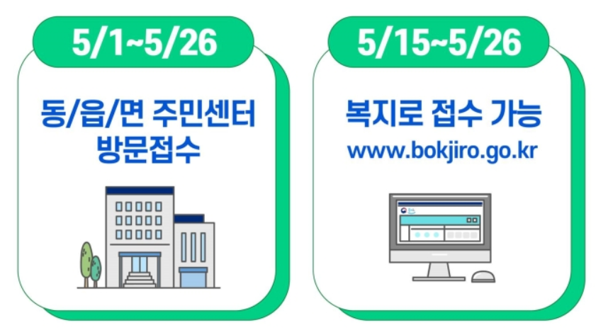 신청 방법은 오는 26일까지 주소지 시군구 내 가까운 읍면동사무소를 방문하거나, 보건복지부(복지부)가 운영하는 복지포털사이트 홈페이지에서 다음 달 15일부터 신청할 수 있습니다. 단, 초기 2주간은 출생일 끝자리 기준으로 5부제로 모집하며, 15일부터 26일까지는 자율 신청입니다.