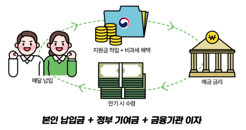 매달 일정 금액을 납입하면 지원금 적립과 비과세혜택, 예금금리가 더해져 만기시 수령하는 구조입니다.