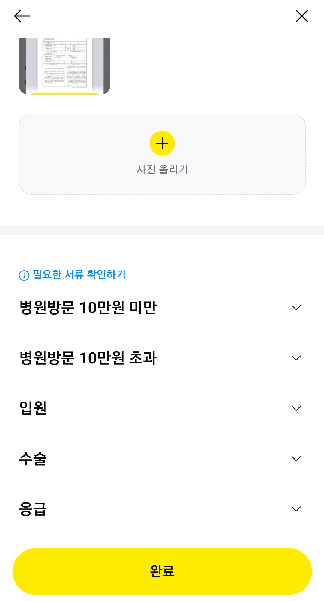 7. 진료비 영수증 서류를 첨부하고 완료버튼을 누르면 끝!