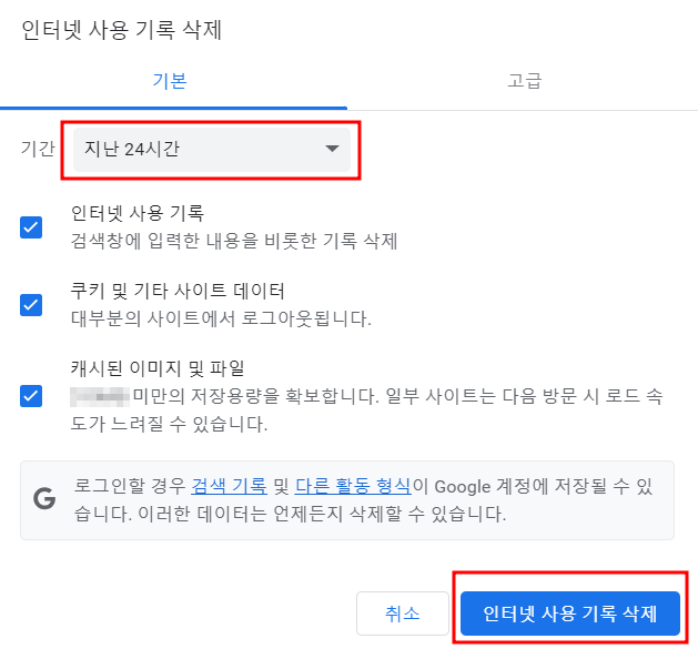 5. 인터넷 사용기록 삭제 - 기간 옵션을 선택하고 삭제 버튼을 누르면 완료!