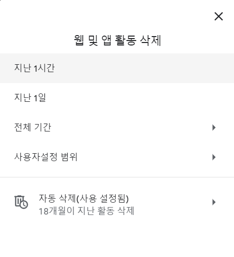 지난 1시간, 24시간, 일주일, 한달 등 삭제하고 싶은 원하는 기간을 설정하고 삭제할수 있습니다.