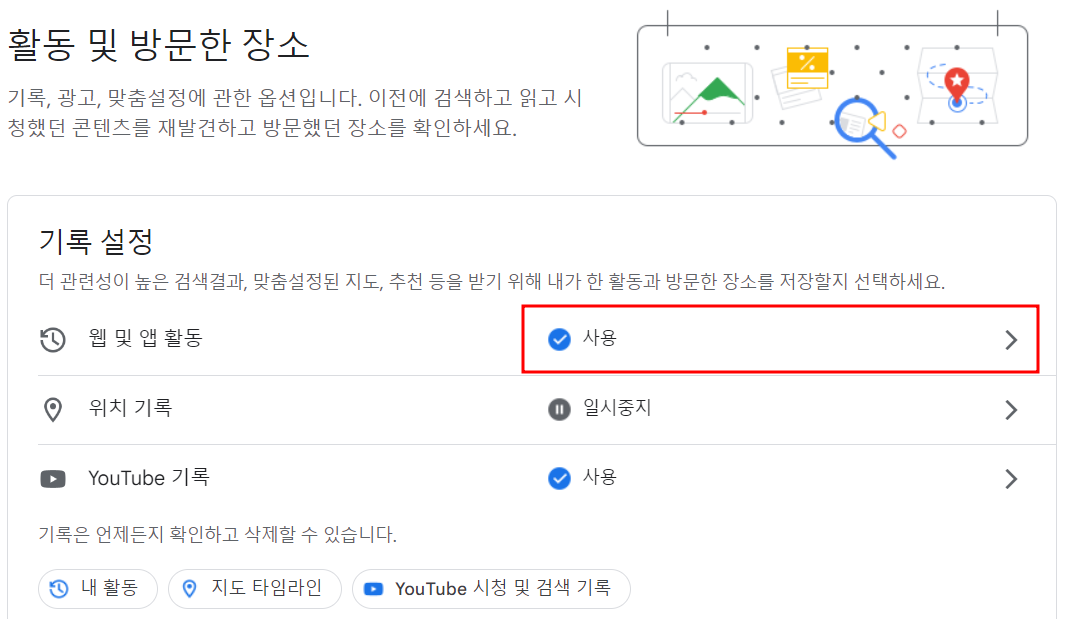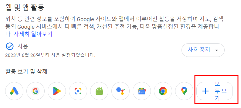 5. 웹 및 앱 활동 오른쪽에 있는 현재 사용으로 설정되어 있는 버튼을 클릭합니다.