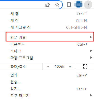 2. 버튼을 클릭하고 여러 메뉴 중 방문기록을 누르고 들어갑니다.