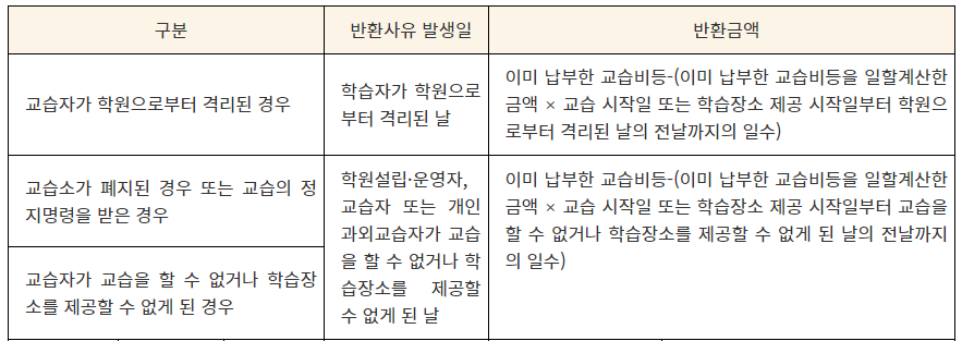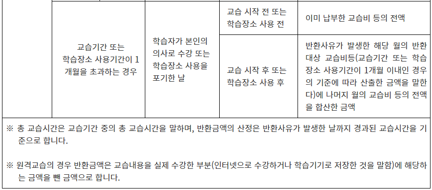 교습이 시작하기 전에 수강생이 수강 포기할 경우 이미 납부한 수강료는 전액 환불됩니다. 그러나 교습이 이미 시작된 경우, 반환사유 발생일로부터 남은 교육기간에 따라 수강료가 환급됩니다. 이때, 수강 기간에 따라 '수강기간 1개월 이내'와 '1개월 초과' 두 가지로 나뉩니다.
