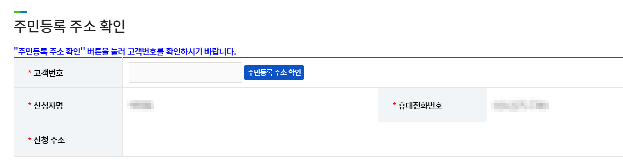 주민등록주소 확인작업을 거치면 위의 고객번호를 포함한 정보들이 자동으로 입력됩니다.