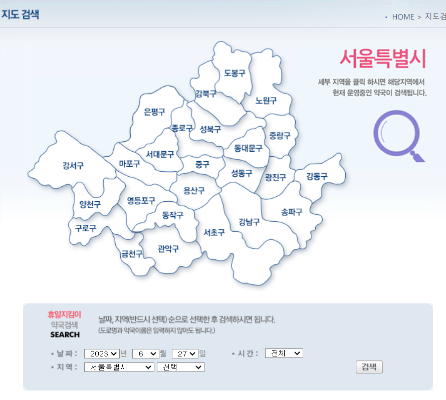 휴일지킴이약국 찾기, 공공심야약국 찾기, 심야약국, 연중무휴약국 검색