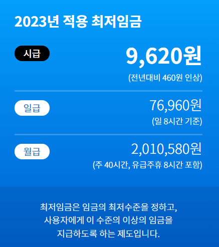 2023년 현재 최저임금에 따른 시급, 일급, 월급을 아래와 같습니다.