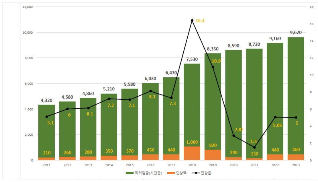 2011년 부터의 최저임금과 인상률을 살펴보면 다음과 같습니다.
