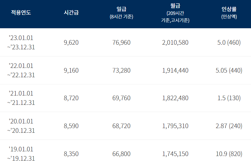 아래의 표는 최초로 최저시급 8,000원의 벽을 넘었던 2019년부터의 최저임금입니다.