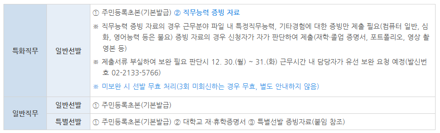- 특화직무 예시: 영상 제작, 데이터 관리, 외국어 활용 등 전문성 요구