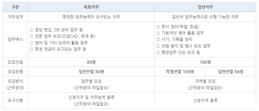 - 일반직무 예시: 행정업무 보조, 민원 응대, 문서 정리 등