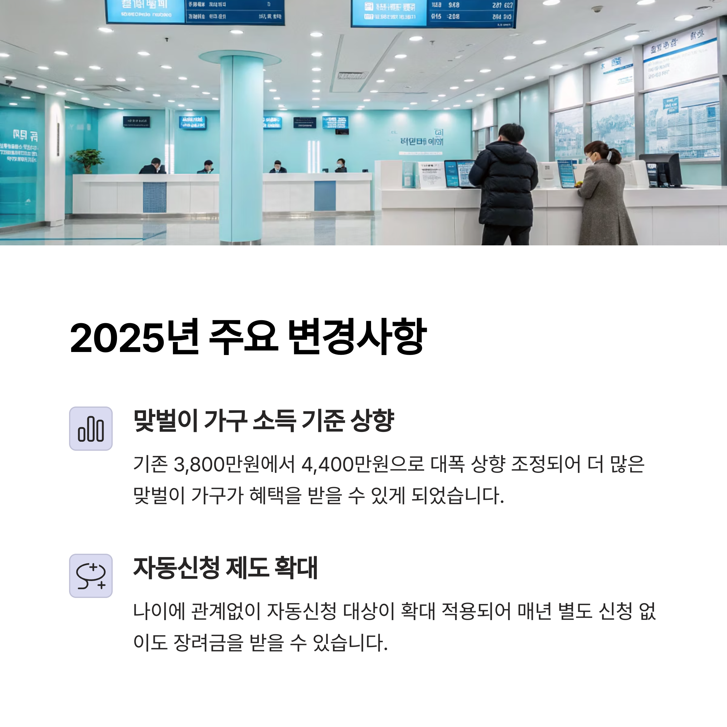 가장 큰 변화는 바로 맞벌이 가구 소득 기준 상향입니다.