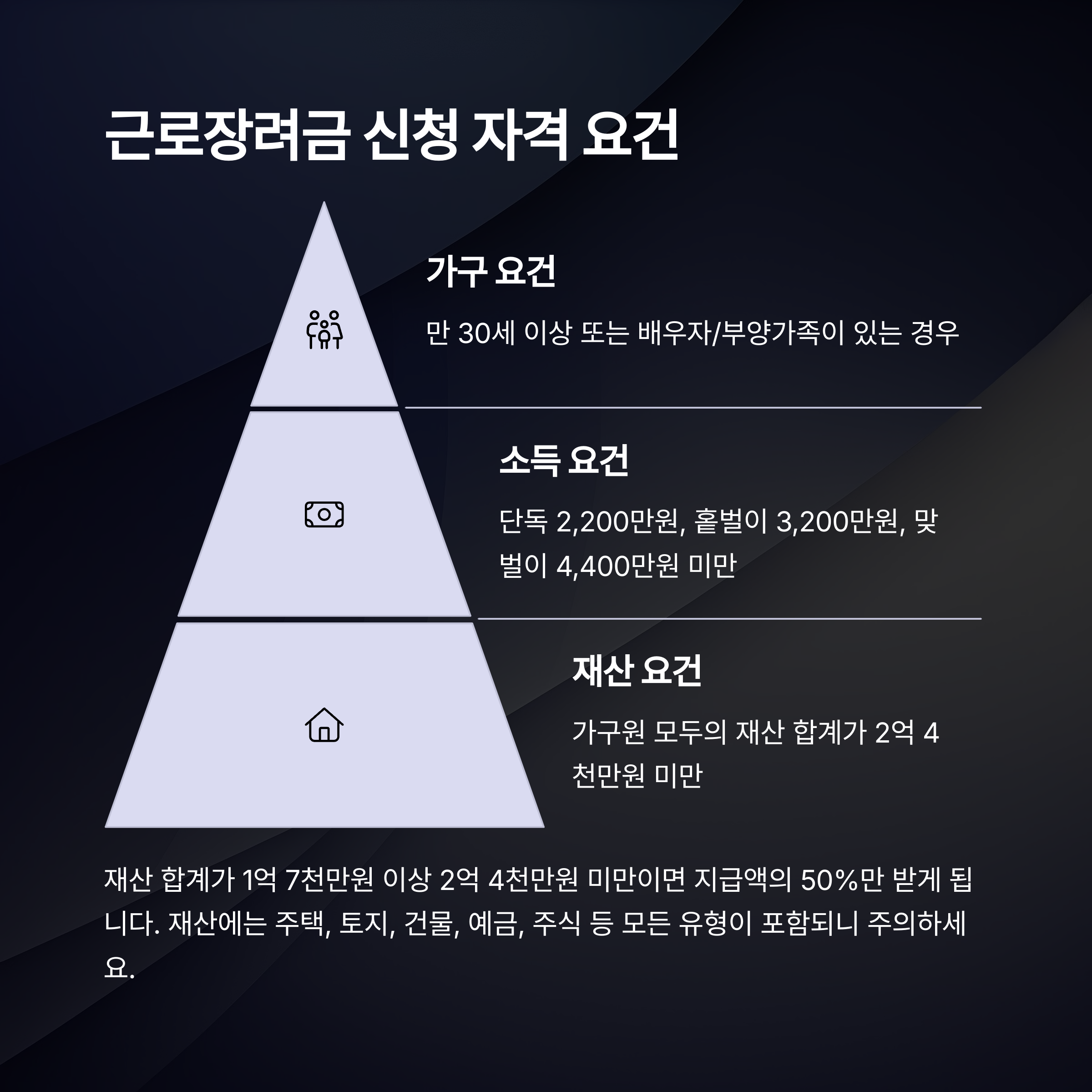 근로장려금 자격 요건은 크게 세 가지로 나눌 수 있습니다: