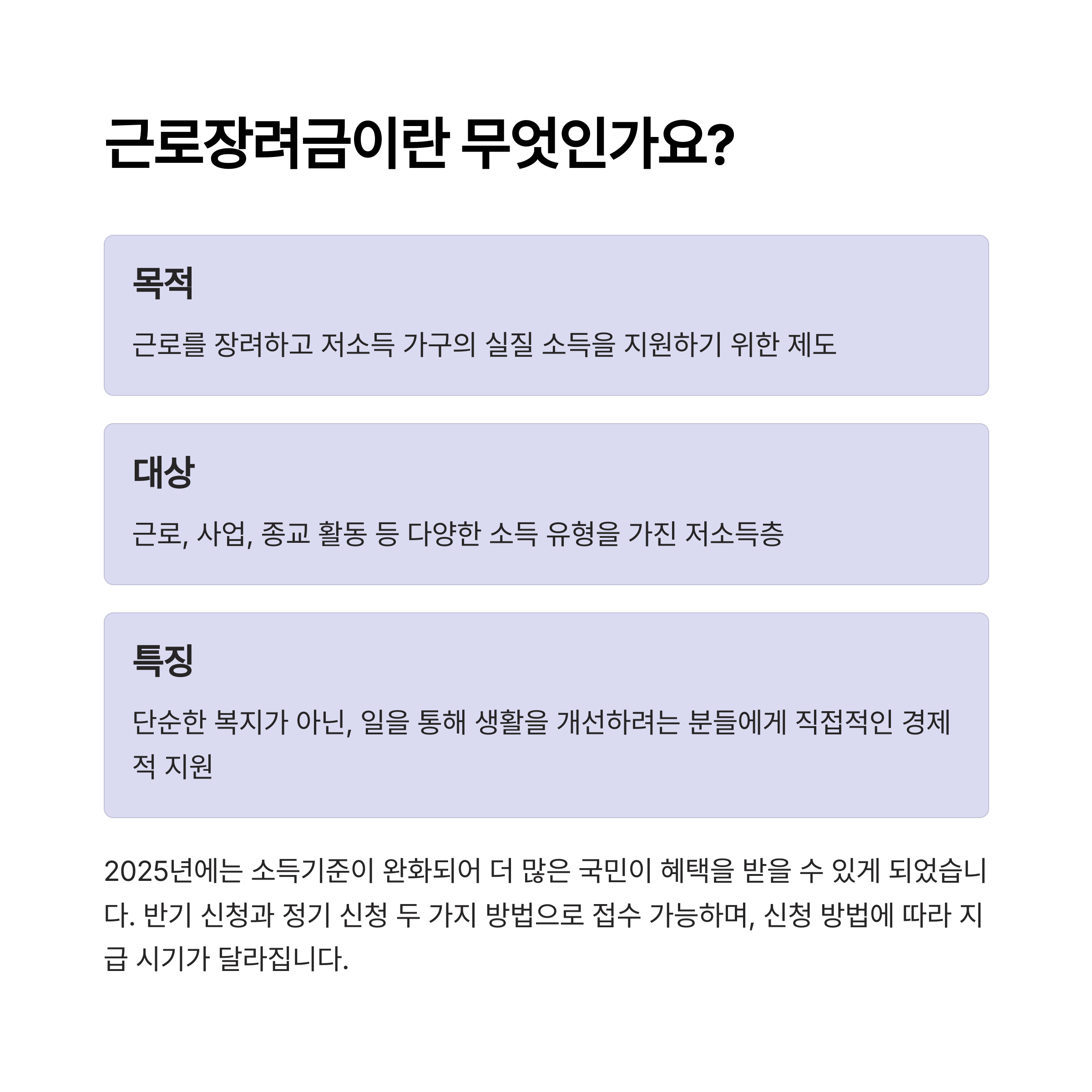 근로장려금은 근로를 장려하고 저소득 가구의 실질 소득을 지원하기 위해 마련된 제도입니다. 단순한 복지가 아니라, 일을 통해 생활을 개선하려는 분들에게 직접적인 경제적 지원을 제공하는 형태입니다. 근로, 사업, 종교 활동 등 다양한 소득 유형을 가진 분들이 대상이 될 수 있습니다.
