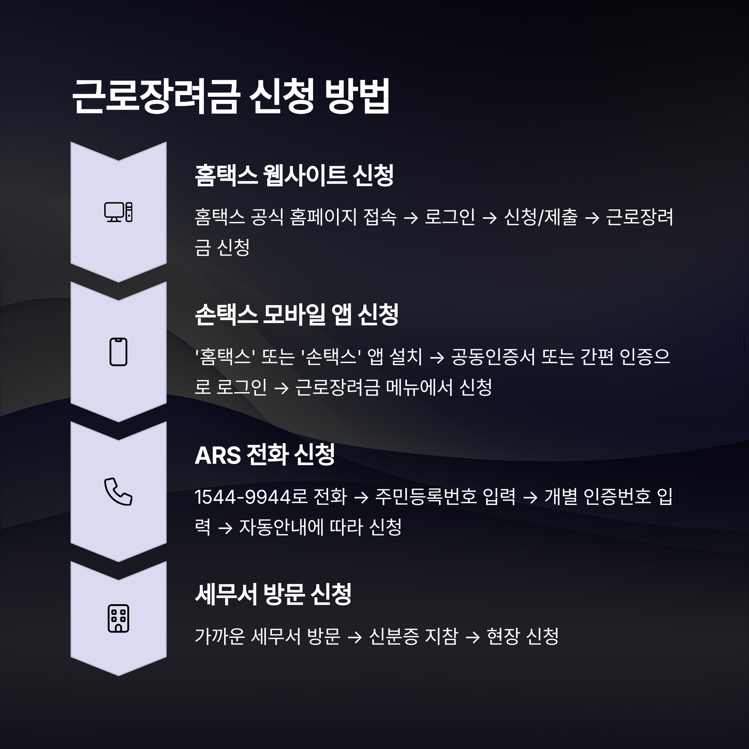 근로장려금 신청은 매우 간편합니다. 여러 방법이 마련되어 있어 본인 상황에 맞게 선택하면 됩니다.